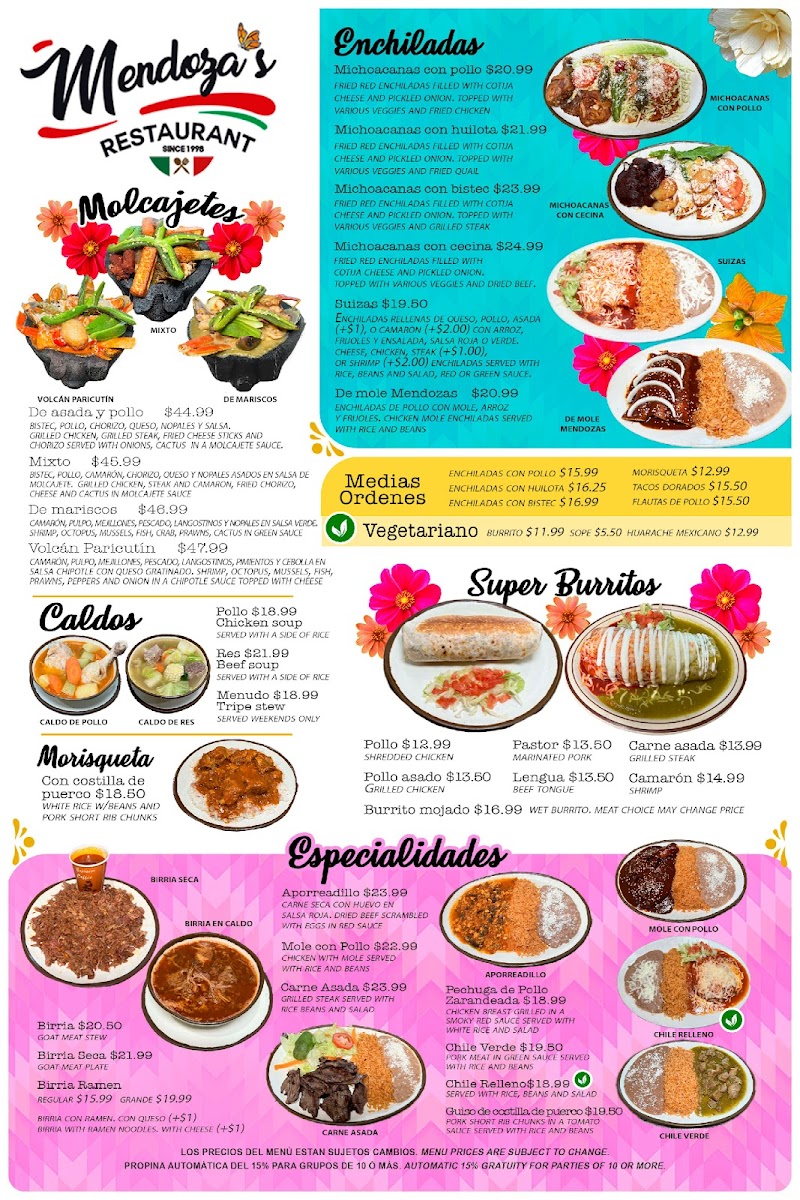 What truly sets Mendoza's apart is the passion for detail evident in each dish, complemented by an attentive and friendly staff who enhance your dining experience. The warmth exuded by the team creates a welcoming atmosphere, ensuring every visit feels like returning home. Customers rave about the quality and authenticity of the food, with many highlighting dishes like the Birria and enchiladas rojas suizas as exceptional highlights. One satisfied customer, Fatima Saldivar, expressed her delight in the menu consistency and the generous portions that make every meal worthwhile. And if you're lucky, you might catch a lively serenade from talented musicians wandering through the restaurant!